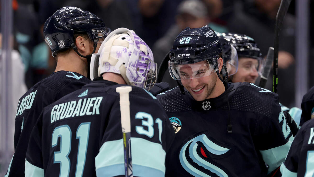 SEATTLE, WASHINGTON - NOVEMBER 16: Philipp Grubauer #31 and Vince Dunn #29 of the Seattle Kraken celebrate after beating the New York Islanders in a shootout at Climate Pledge Arena on November 16, 2023 in Seattle, Washington. (Photo by Steph Chambers/Getty Images)Photo: Steph Chambers / Getty Images Sport / Getty Images