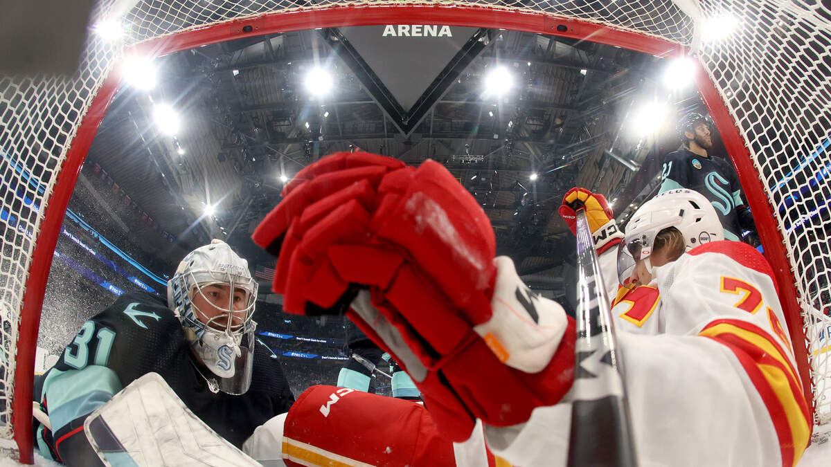 SEATTLE, WASHINGTON - NOVEMBER 20: Martin Pospisil #76 of the Calgary Flames scores a goal, which was later disallowed for goaltender interference, against Philipp Grubauer #31 of the Seattle Kraken during the first period at Climate Pledge Arena on November 20, 2023 in Seattle, Washington. (Photo by Steph Chambers/Getty Images)Photo: Steph Chambers / Getty Images Sport / Getty Images