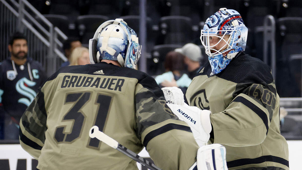 SEATTLE, WASHINGTON - NOVEMBER 11: Philipp Grubauer #31 and Chris Driedger #60 of the Seattle Kraken high five before the game against the Anaheim Ducks on November 11, 2021 at Climate Pledge Arena in Seattle, Washington. (Photo by Steph Chambers/Getty Images)Photo: Getty Images