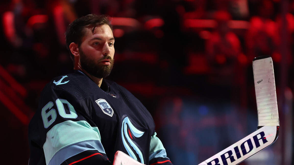 SEATTLE, WASHINGTON - DECEMBER 30: Chris Driedger #60 of the Seattle Kraken looks on before the game against the Calgary Flames at Climate Pledge Arena on December 30, 2021 in Seattle, Washington. (Photo by Steph Chambers/Getty Images)Photo: Getty Images