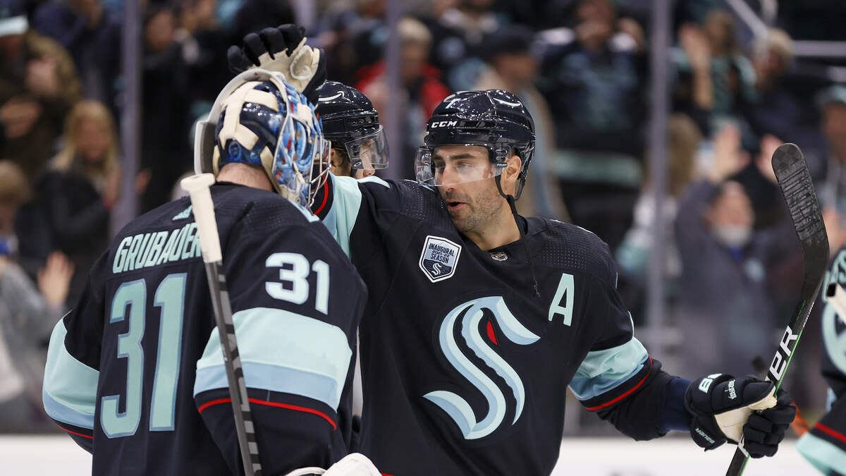 SEATTLE, WASHINGTON - NOVEMBER 24: Philipp Grubauer #31 and Jordan Eberle #7 of the Seattle Kraken celebrate after beating the Carolina Hurricanes 2-1 at Climate Pledge Arena on November 24, 2021 in Seattle, Washington. (Photo by Steph Chambers/Getty Images)Photo: Getty Images