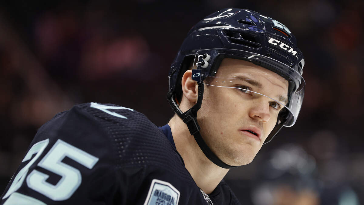 SEATTLE, WASHINGTON - MARCH 30: Karson Kuhlman #25 of the Seattle Kraken warms up before the game against the Vegas Golden Knights at Climate Pledge Arena on March 30, 2022 in Seattle, Washington. (Photo by Steph Chambers/Getty Images)Photo: Getty Images