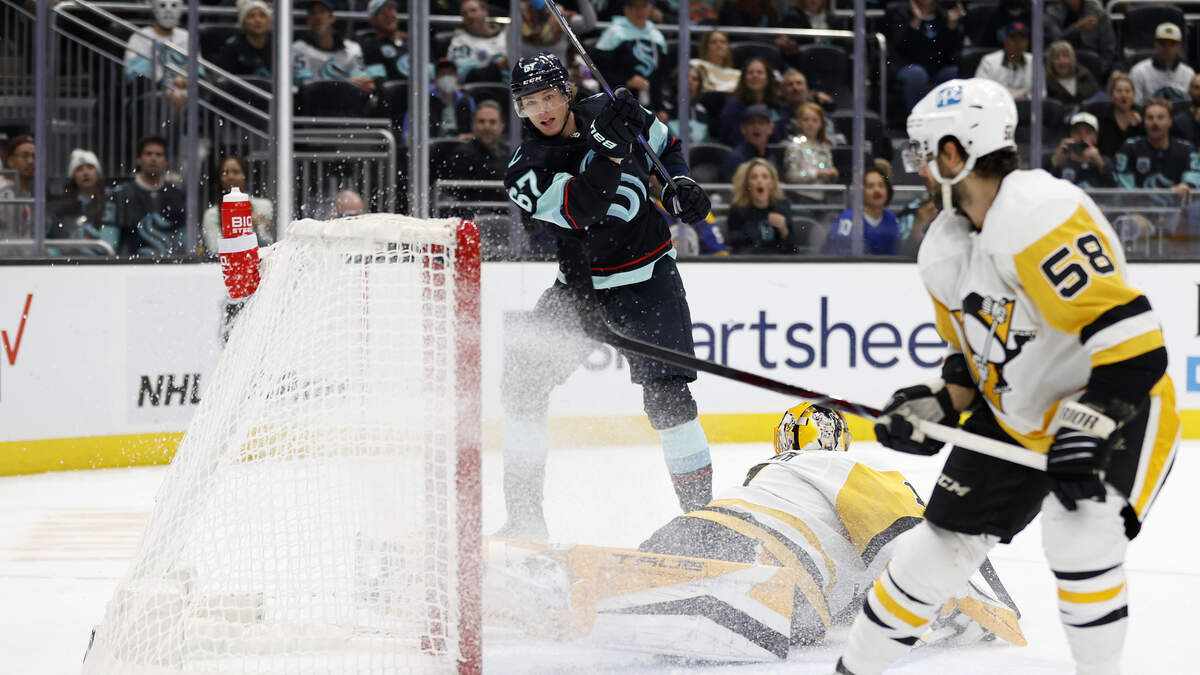 SEATTLE, WASHINGTON - OCTOBER 29: Morgan Geekie #67 of the Seattle Kraken scores against Casey DeSmith #1 of the Pittsburgh Penguins during the second period of the game at Climate Pledge Arena on October 29, 2022 in Seattle, Washington. (Photo by Steph Chambers/Getty Images)Photo: Getty Images