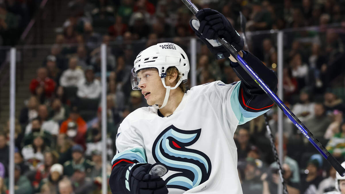 ST PAUL, MN - NOVEMBER 03: Morgan Geekie #67 of the Seattle Kraken celebrates his goal against the Minnesota Wild in the second period at Xcel Energy Center on November 3, 2022 in St Paul, Minnesota. (Photo by David Berding/Getty Images)Photo: Getty Images