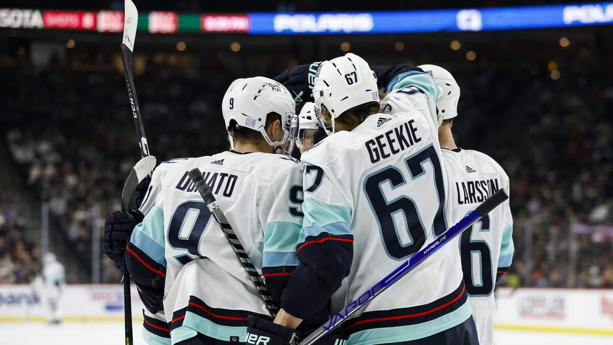 ST PAUL, MN - NOVEMBER 03: Morgan Geekie #67 of the Seattle Kraken celebrates his goal against the Minnesota Wild with teammates in the second period at Xcel Energy Center on November 3, 2022 in St Paul, Minnesota. (Photo by David Berding/Getty Images)Photo: Getty Images