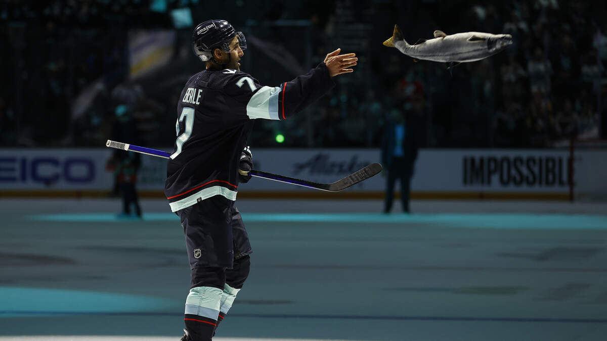 SEATTLE, WASHINGTON - OCTOBER 29: Jordan Eberle #7 of the Seattle Kraken throws a stuffed animal toy salmon into the stands after being named the first star of the game against the Pittsburgh Penguins at Climate Pledge Arena on October 29, 2022 in Seattle, Washington. (Photo by Steph Chambers/Getty Images)Photo: Getty Images