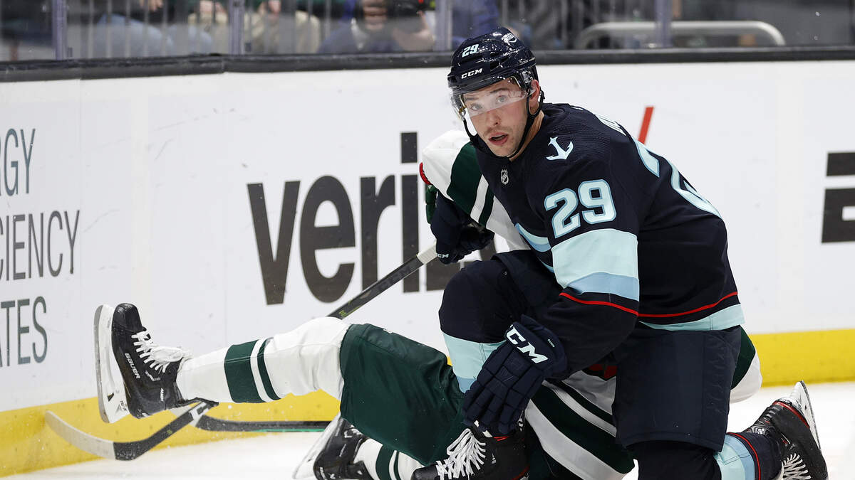 SEATTLE, WASHINGTON - NOVEMBER 11: Vince Dunn #29 of the Seattle Kraken plays the puck against Kirill Kaprizov #97 of the Minnesota Wild during the third period at Climate Pledge Arena on November 11, 2022 in Seattle, Washington. (Photo by Steph Chambers/Getty Images)Photo: Getty Images