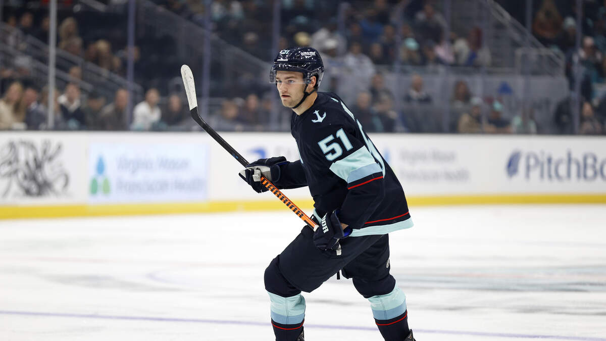 SEATTLE, WASHINGTON - OCTOBER 17: Shane Wright #51 of the Seattle Kraken skates against the Carolina Hurricanes during the first period at Climate Pledge Arena on October 17, 2022 in Seattle, Washington. (Photo by Steph Chambers/Getty Images)Photo: Getty Images