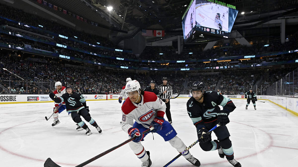 The Canadiens though won the battle on the big scoreboard. They broke free of a 1-1 tie with a pair of second period goals in seven seconds and though visibly tired at the end of a four-game road trip, held on to defeat the Kraken 4-2 before sellout crowd on Tuesday at Climate Pledge Arena.