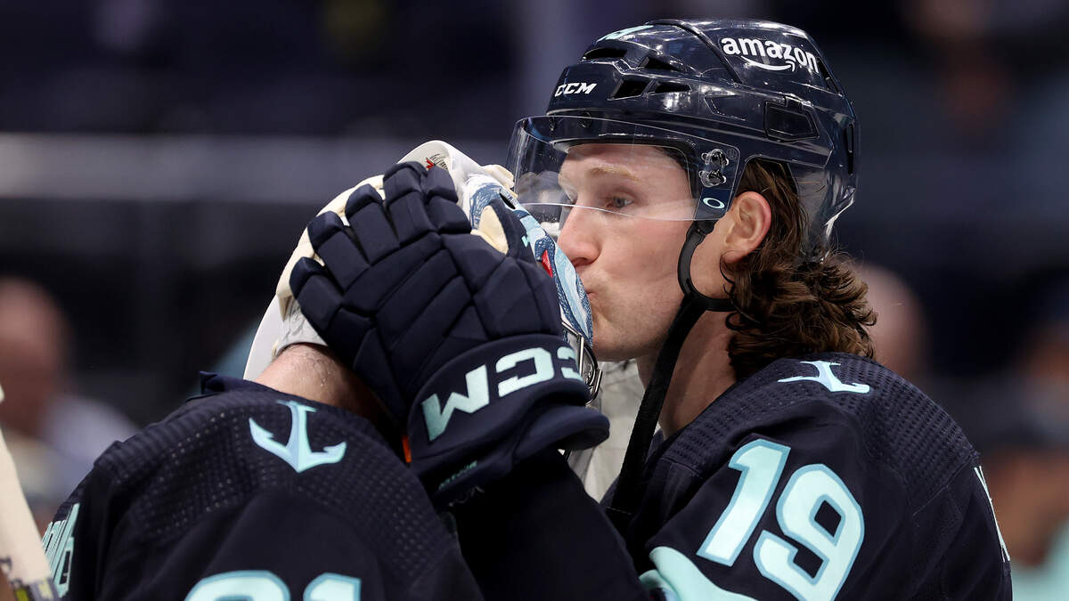 SEATTLE, WASHINGTON - MARCH 07: Jared McCann #19 of the Seattle Kraken kisses the helmet of Philipp Grubauer #31 after their 5-2 win against the Anaheim Ducks at Climate Pledge Arena on March 07, 2023 in Seattle, Washington. (Photo by Steph Chambers/Getty Images)Photo: Getty Images