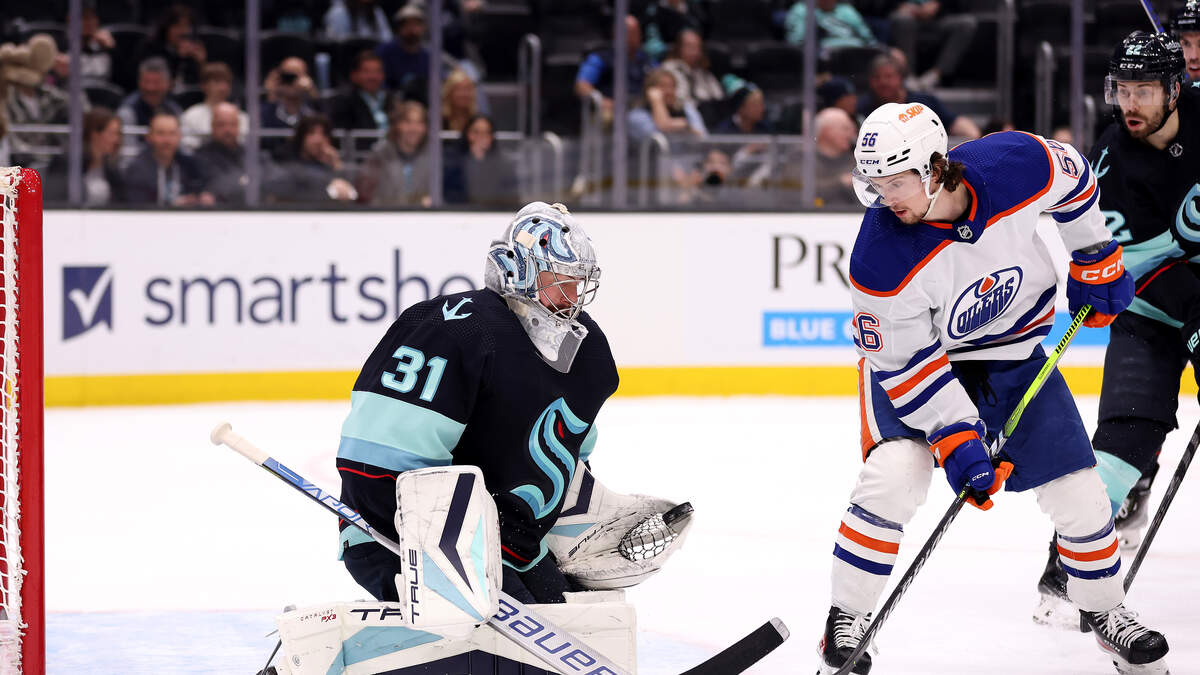 SEATTLE, WASHINGTON - MARCH 18: Philipp Grubauer #31 of the Seattle Kraken makes a save in front of Kailer Yamamoto #56 of the Edmonton Oilers during the first period at Climate Pledge Arena on March 18, 2023 in Seattle, Washington. (Photo by Steph Chambers/Getty Images)Photo: Getty Images