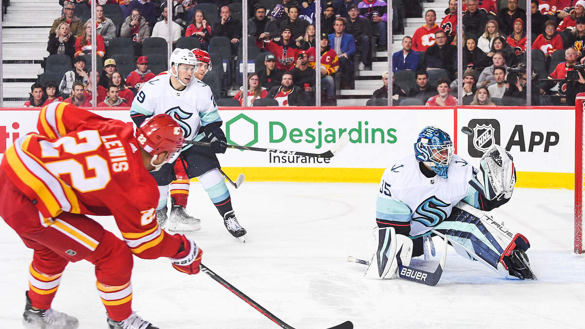 CALGARY, CANADA - NOVEMBER 1: Trevor Lewis #22 of the Calgary Flames takes a shot on Joey Daccord #35 of the Seattle Kraken during the third period of an NHL game at Scotiabank Saddledome on November 1, 2022 in Calgary, Alberta, Canada. The Kraken defeated the Flames 5-4. (Photo by Derek Leung/Getty Images)Photo: Getty Images