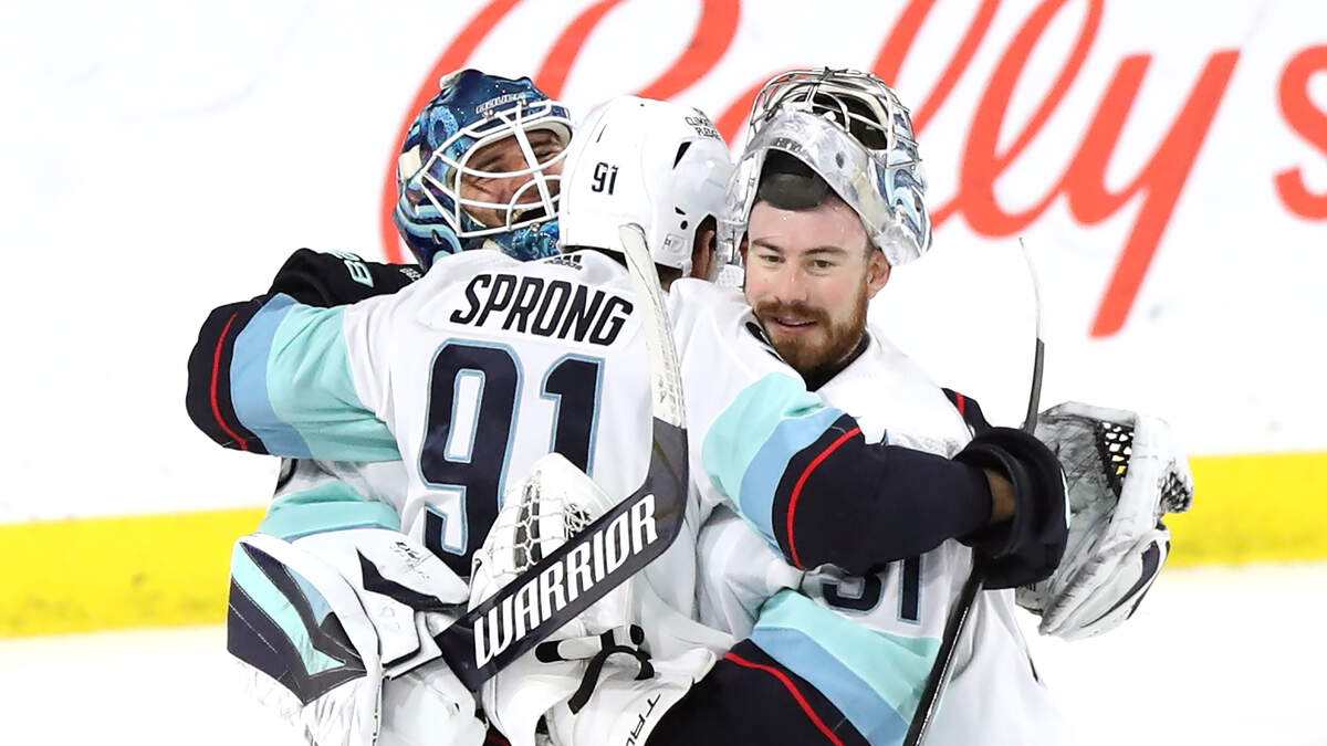 TEMPE, ARIZONA - APRIL 10: Daniel Sprong #91, winning goalie Philipp Grubauer #31 and goalie Joey Daccord #35 of the Seattle Kraken celebrate after a win against the Arizona Coyotes at Mullett Arena on April 10, 2023 in Tempe, Arizona. (Photo by Zac BonDurant/Getty Images)Photo: Getty Images