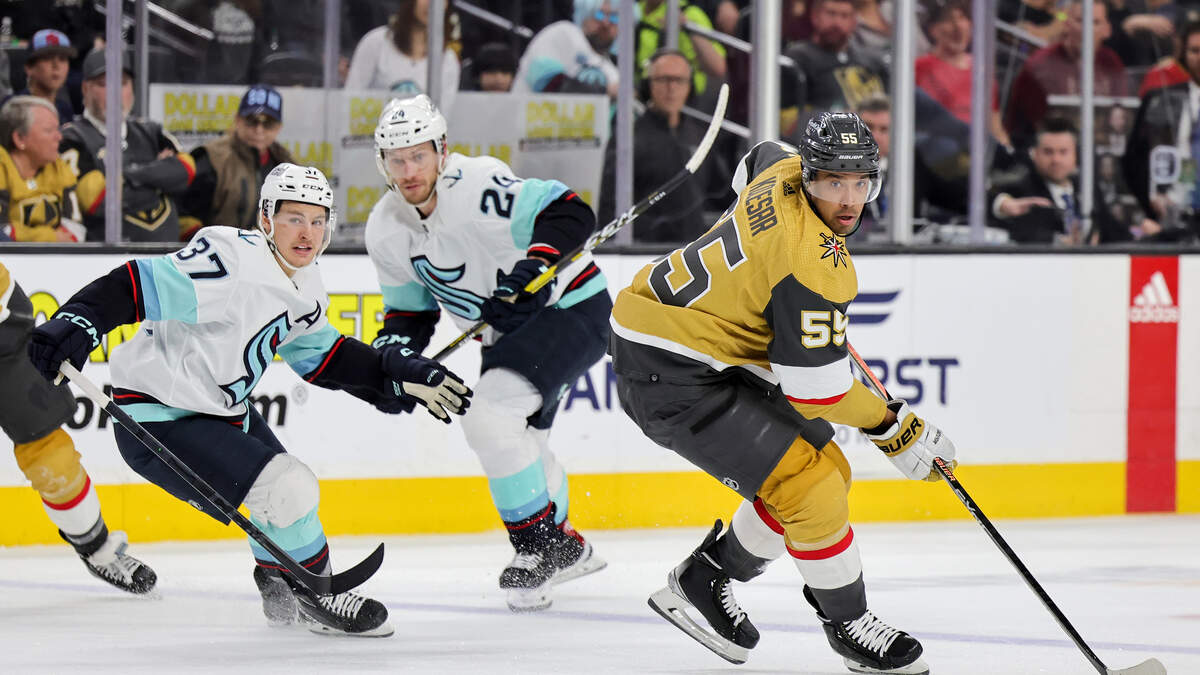 LAS VEGAS, NEVADA - APRIL 11: Keegan Kolesar #55 of the Vegas Golden Knights skates with the puck ahead of Yanni Gourde #37 and Jamie Oleksiak #24 of the Seattle Kraken in the second period of their game at T-Mobile Arena on April 11, 2023 in Las Vegas, Nevada. The Golden Knights defeated the Kraken 4-1. (Photo by Ethan Miller/Getty Images)Photo: Getty Images
