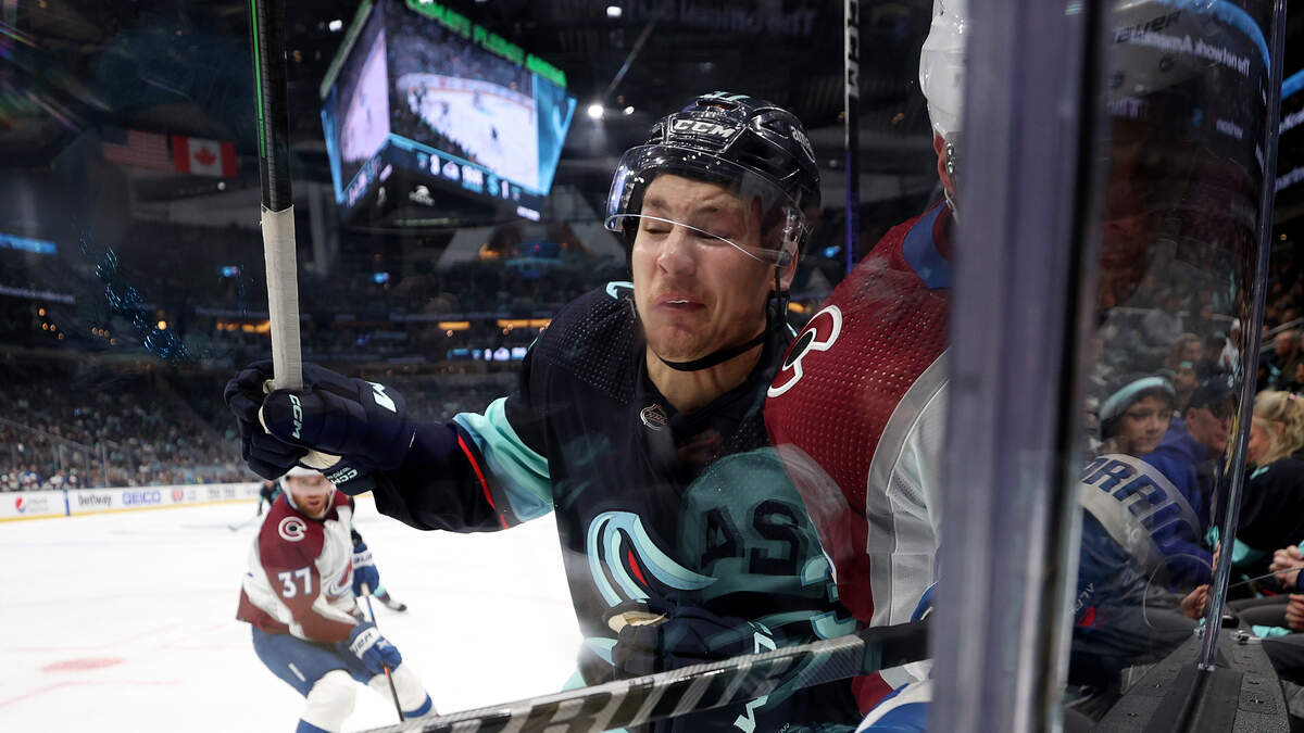 SEATTLE, WASHINGTON - APRIL 22: Yanni Gourde #37 of the Seattle Kraken checks Erik Johnson #6 of the Colorado Avalanche during the second period in Game Three of the First Round of the 2023 Stanley Cup Playoffs at Climate Pledge Arena on April 22, 2023 in Seattle, Washington. (Photo by Steph Chambers/Getty Images)Photo: Getty Images