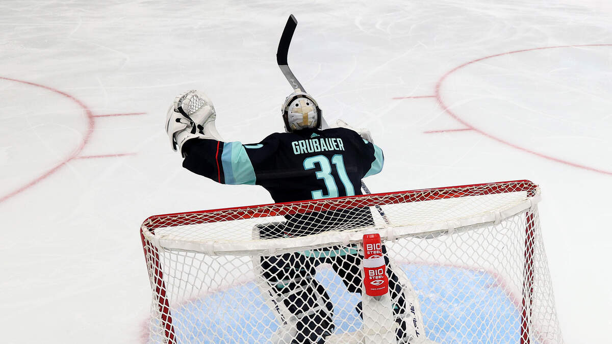 SEATTLE, WASHINGTON - APRIL 24: Philipp Grubauer #31 of the Seattle Kraken celebrates the game-winning overtime goal against the Colorado Avalanche in Game Four of the First Round of the 2023 Stanley Cup Playoffs at Climate Pledge Arena on April 24, 2023 in Seattle, Washington. (Photo by Steph Chambers/Getty Images)Photo: Getty Images