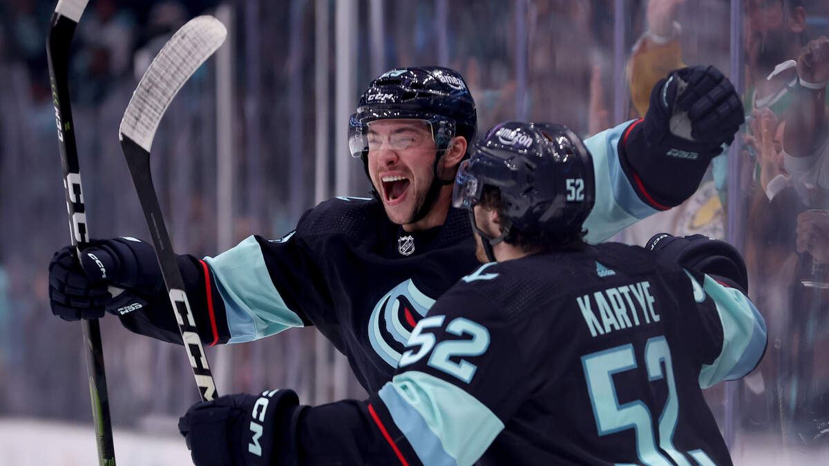 SEATTLE, WASHINGTON - MAY 13: Vince Dunn #29 and Tye Kartye #52 of the Seattle Kraken celebrate a goal by Kartye during the second period against the Dallas Stars in Game Six of the Second Round of the 2023 Stanley Cup Playoffs at Climate Pledge Arena on May 13, 2023 in Seattle, Washington. (Photo by Steph Chambers/Getty Images)Photo: Steph Chambers / Getty Images Sport / Getty Images