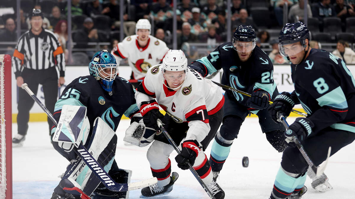 SEATTLE, WASHINGTON - JANUARY 04: Joey Daccord #35 of the Seattle Kraken makes a save against Brady Tkachuk #7 of the Ottawa Senators during the first period at Climate Pledge Arena on January 04, 2024 in Seattle, Washington. (Photo by Steph Chambers/Getty Images)Photo: Steph Chambers / Getty Images Sport / Getty Images