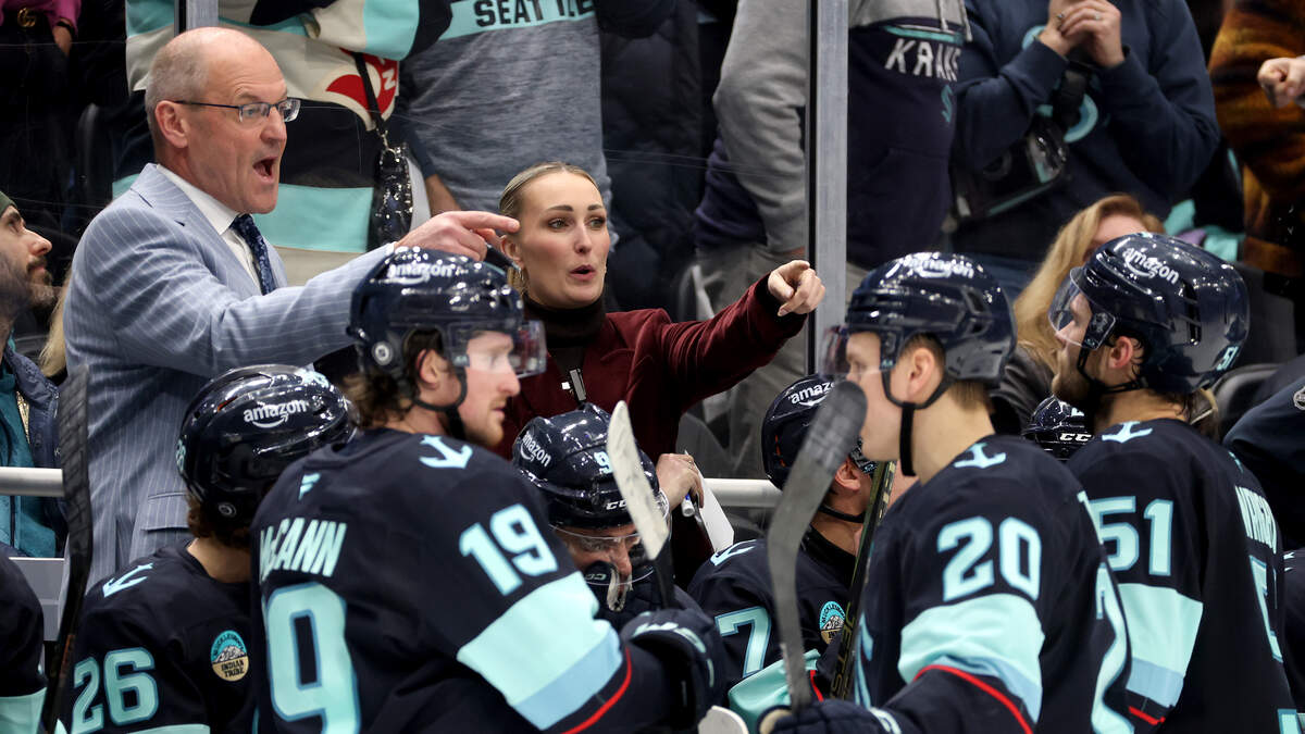 SEATTLE, WASHINGTON - NOVEMBER 30: Head coach Dan Bylsma and assistant coach Jessica Campbell of the Seattle Kraken react during the third period against the San Jose Sharks at Climate Pledge Arena on November 30, 2024 in Seattle, Washington. (Photo by Steph Chambers/Getty Images)Photo: Steph Chambers / Getty Images Sport / Getty Images