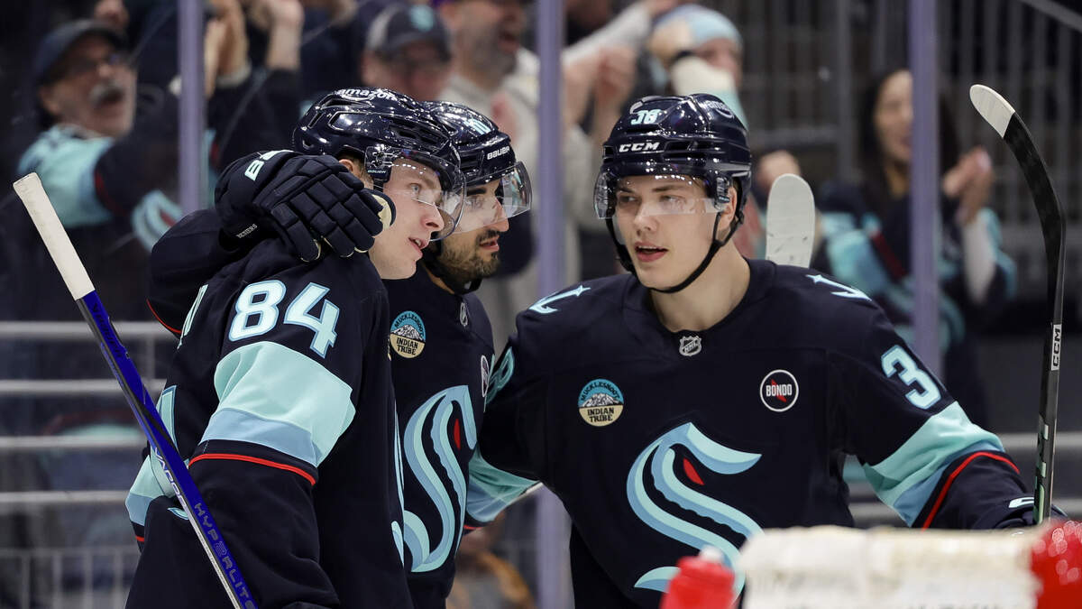 SEATTLE, WASHINGTON - MARCH 27: Matty Beniers #10 of the Seattle Kraken celebrates his goal with Kaapo Kakko #84 and Jani Nyman #38 during the second period against the Edmonton Oilers at Climate Pledge Arena on March 27, 2025 in Seattle, Washington. (Photo by Ryan Sirius Sun/Getty Images)Photo: Ryan Sirius Sun / Getty Images Sport / Getty Images
